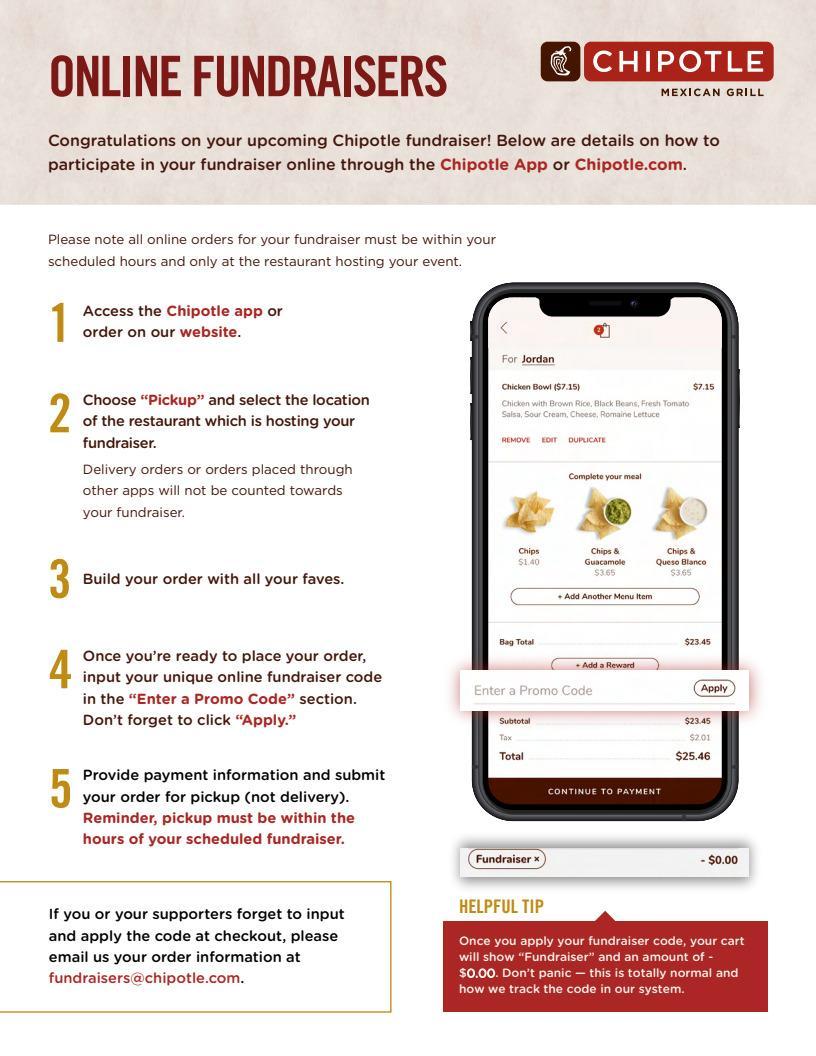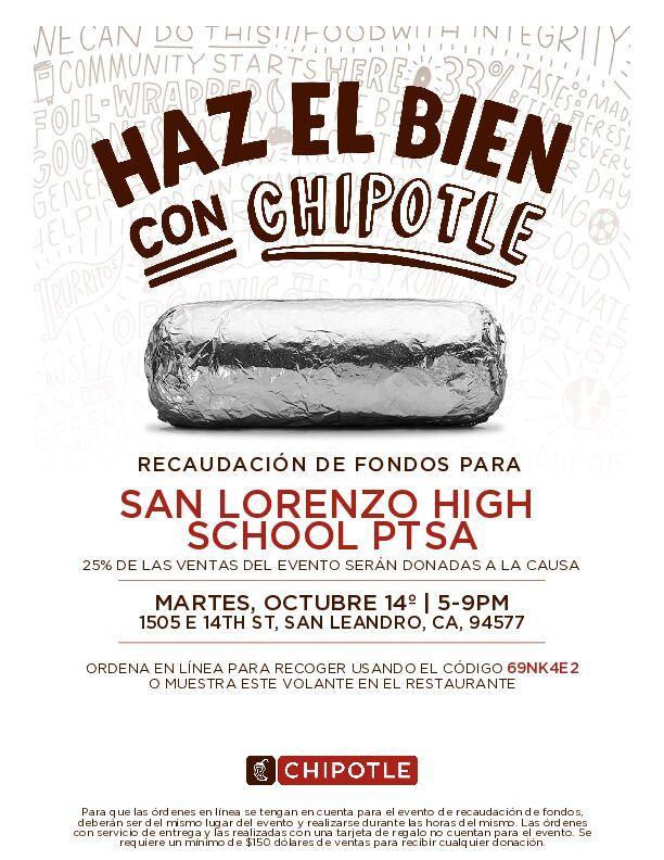 Please come out to Chipotle at 1505 E. 14th Street, San Leandro on Tuesday, October 14th between 5:00 pm - 9:00 pm to support our dinner fundraiser where 25% of all purchases support our Parent Teacher Student Association.